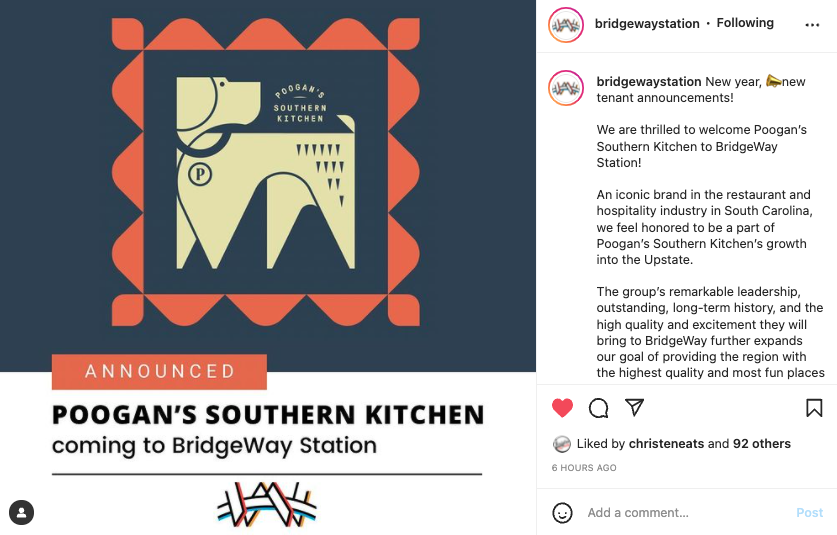 BridgeWay Station is bringing a taste of Charleston to its restaurant lineup with the addition of Poogan’s Southern Kitchen.